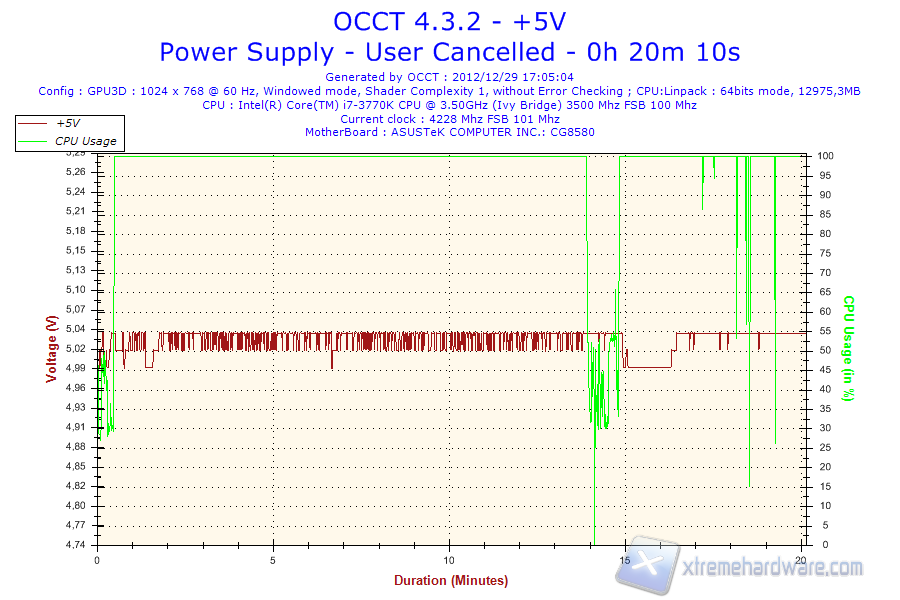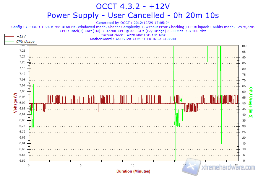 Possiamo subito osservare che la lettura della tensione +12V non sia corretta, in quanto il software rileva un valore poco inferiore ai 7V. Prendendo per buone le letture effettuate dal tool sul 3.3 e 5V possiamo notare continui spike di tensione nell’ordine delle decine di mV; tuttavia, è possibile apprezzare un importante calo di tensione superati i 15 minuti di test.