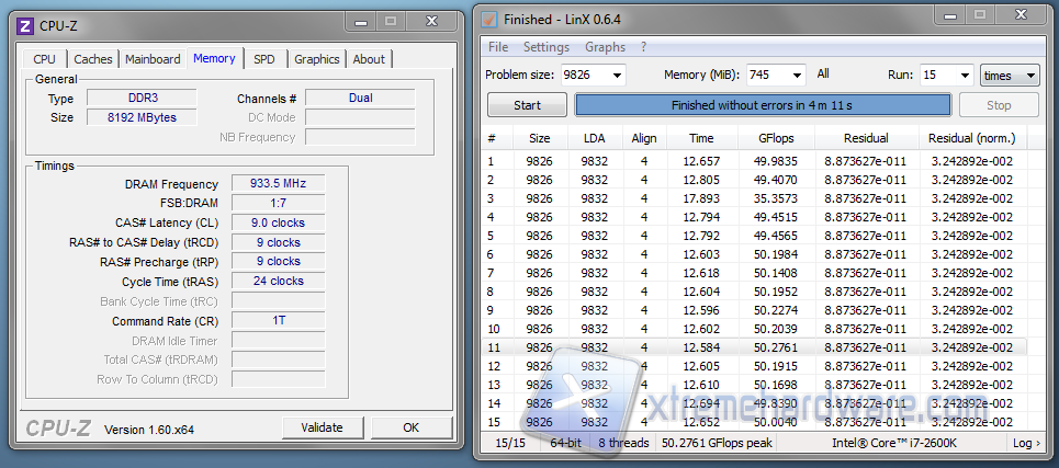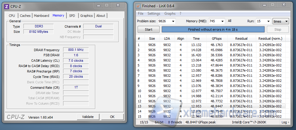 Abbiamo deciso infine di testare le memorie con delle impostazioni che andassero a compensare la diminuzione della frequenza, ma allo stesso tempo senza aumentare di molto i timings, il tutto abbassando il voltaggio a 1,57V, ovvero alla tensione consigliata per i sistemi Sandy Bridge. Il risultato è abbastanza soddisfacente; a 1866 MHz e con timings di 9-9-9-24 1T, il sistema è risultato molto stabile, anche attraverso 15 cicli di LinX.