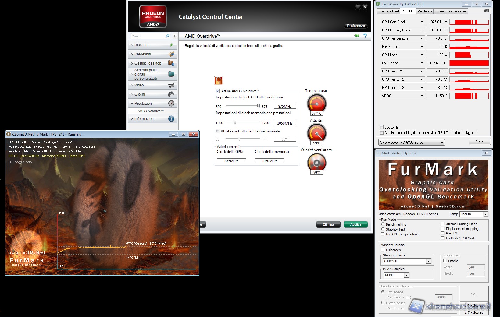 Non contenti dei risultati ottenuti tramite il CCC che come immaginavamo bloccava di fatto le potenzialità della scheda prodotta da Gigabyte, abbiamo pensato di usare un apposito tool normalmente usato per aumentare le frequenze di core e memorie. I risultati ottenuti sono davvero superlativi, abbiamo raggiunto una frequenza stabile per il core di ben 955 MHz. La scheda inoltre è riuscita a concludere benchmark a ben 975 MHz anche se ovviamente non in maniera stabile. Mentre le memorie le abbiamo settate tranquillamente a 1250 MHz come da specifica Hynix. Potete osservare questi risultati nelle immagini sottostanti (segnaliamo come gpu-z non rilevi correttamente il numero di rpm della ventola di raffreddamento):